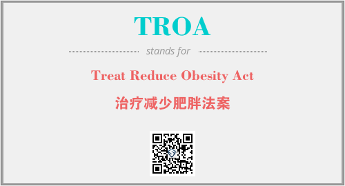 上述内容是“Treat Reduce Obesity Act”作为“TROA”的缩写,解释为“治疗减少肥胖法案”时的信息,以及英文缩略词TROA所代表的英文单词,其对应的中文拼音、详细解释以及在英文中的流行度和相关分类、应用领域及应用示例等。