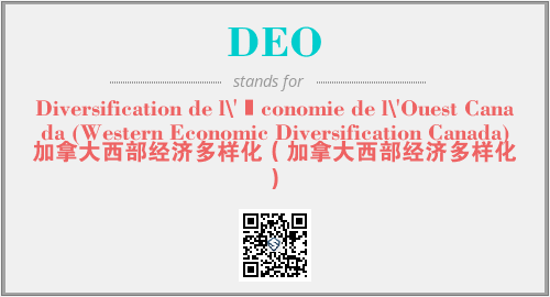 上述内容是“Diversification de l\'Économie de l\'Ouest Canada (Western Economic Diversification Canada)”作为“DEO”的缩写,解释为“加拿大西部经济多样化(加拿大西部经济多样化)”时的信息,以及英文缩略词DEO所代表的英文单词,其对应的中文拼音、详细解释以及在英文中的流行度和相关分类、应用领域及应用示例等。