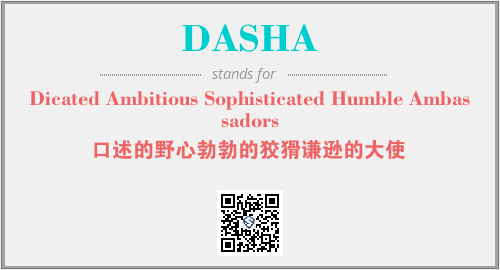 上述内容是“Dicated Ambitious Sophisticated Humble Ambassadors”作为“DASHA”的缩写,解释为“口述的野心勃勃的狡猾谦逊的大使”时的信息,以及英文缩略词DASHA所代表的英文单词,其对应的中文拼音、详细解释以及在英文中的流行度和相关分类、应用领域及应用示例等。