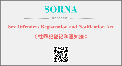 上述内容是“Sex Offenders Registration and Notification Act”作为“SORNA”的缩写,解释为“《性罪犯登记和通知法》”时的信息,以及英文缩略词SORNA所代表的英文单词,其对应的中文拼音、详细解释以及在英文中的流行度和相关分类、应用领域及应用示例等。