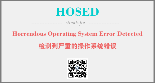上述内容是“Horrendous Operating System Error Detected”作为“HOSED”的缩写,解释为“检测到严重的操作系统错误”时的信息,以及英文缩略词HOSED所代表的英文单词,其对应的中文拼音、详细解释以及在英文中的流行度和相关分类、应用领域及应用示例等。
