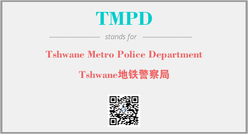 上述内容是“Tshwane Metro Police Department”作为“TMPD”的缩写,解释为“Tshwane地铁警察局”时的信息,以及英文缩略词TMPD所代表的英文单词,其对应的中文拼音、详细解释以及在英文中的流行度和相关分类、应用领域及应用示例等。