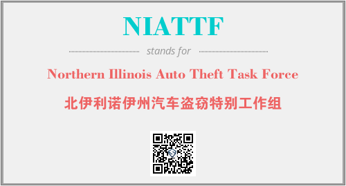 上述内容是“Northern Illinois Auto Theft Task Force”作为“NIATTF”的缩写,解释为“北伊利诺伊州汽车盗窃特别工作组”时的信息,以及英文缩略词NIATTF所代表的英文单词,其对应的中文拼音、详细解释以及在英文中的流行度和相关分类、应用领域及应用示例等。