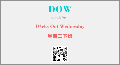 英文缩略词“DOW”经常作为“D*cks Out Wednesday”的英文缩写来使用,中文表示:“星期三下班”。本文将详细介绍英文缩写词DOW所代表英文单词,其对应的中文拼音、详细解释以及在英语中的流行度。此外,还有关于缩略词DOW的分类、应用领域及相关应用示例等。