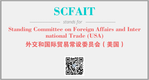 英文缩略词“SCFAIT”经常作为“Standing Committee on Foreign Affairs and International Trade (USA)”的英文缩写来使用,中文表示:“外交和国际贸易常设委员会(美国)”。本文将详细介绍英文缩写词SCFAIT所代表英文单词,其对应的中文拼音、详细解释以及在英语中的流行度。此外,还有关于缩略词SCFAIT的分类、应用领域及相关应用示例等。
