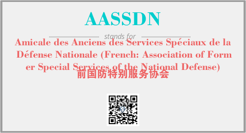 以上为Amicale des Anciens des Services Spéciaux de la Défense Nationale (French: Association of Former Special Services of the National Defense)英文缩略词AASSDN的中文解释,以及该英文缩写在英语的流行度、分类和应用领域方面的信息。