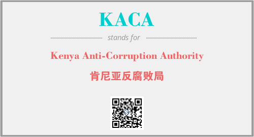 上述内容是“Kenya Anti-Corruption Authority”作为“KACA”的缩写,解释为“肯尼亚反腐败局”时的信息,以及英文缩略词KACA所代表的英文单词,其对应的中文拼音、详细解释以及在英文中的流行度和相关分类、应用领域及应用示例等。