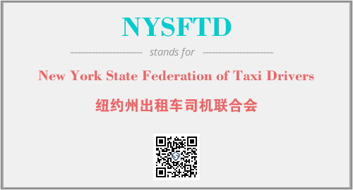 上述内容是“New York State Federation of Taxi Drivers”作为“NYSFTD”的缩写,解释为“纽约州出租车司机联合会”时的信息,以及英文缩略词NYSFTD所代表的英文单词,其对应的中文拼音、详细解释以及在英文中的流行度和相关分类、应用领域及应用示例等。