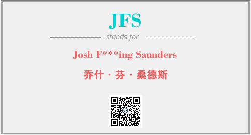 上述内容是“Josh F***ing Saunders”作为“JFS”的缩写,解释为“乔什·芬·桑德斯”时的信息,以及英文缩略词JFS所代表的英文单词,其对应的中文拼音、详细解释以及在英文中的流行度和相关分类、应用领域及应用示例等。