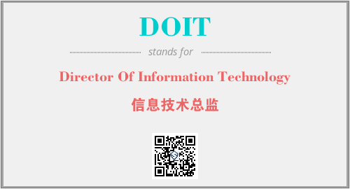 上述内容是“Director Of Information Technology”作为“DOIT”的缩写,解释为“信息技术总监”时的信息,以及英文缩略词DOIT所代表的英文单词,其对应的中文拼音、详细解释以及在英文中的流行度和相关分类、应用领域及应用示例等。