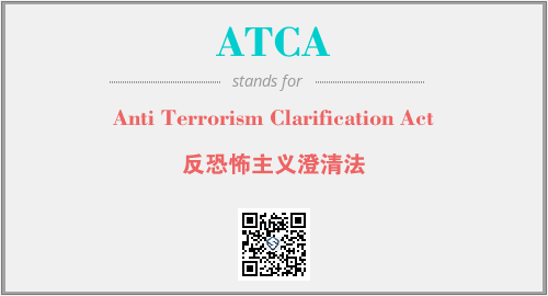 英文缩略词“ATCA”经常作为“Anti Terrorism Clarification Act”的英文缩写来使用,中文表示:“反恐怖主义澄清法”。本文将详细介绍英文缩写词ATCA所代表英文单词,其对应的中文拼音、详细解释以及在英语中的流行度。此外,还有关于缩略词ATCA的分类、应用领域及相关应用示例等。