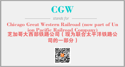 上述内容是“Chicago Great Western Railroad (now part of Union Pacific Railroad Company)”作为“CGW”的缩写,解释为“芝加哥大西部铁路公司(现为联合太平洋铁路公司的一部分)”时的信息,以及英文缩略词CGW所代表的英文单词,其对应的中文拼音、详细解释以及在英文中的流行度和相关分类、应用领域及应用示例等。