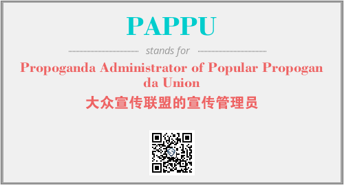 英文缩略词“PAPPU”经常作为“Propoganda Administrator of Popular Propoganda Union”的英文缩写来使用,中文表示:“大众宣传联盟的宣传管理员”。本文将详细介绍英文缩写词PAPPU所代表英文单词,其对应的中文拼音、详细解释以及在英语中的流行度。此外,还有关于缩略词PAPPU的分类、应用领域及相关应用示例等。