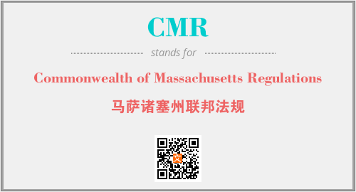 英文缩略词“CMR”经常作为“Commonwealth of Massachusetts Regulations”的英文缩写来使用,中文表示:“马萨诸塞州联邦法规”。本文将详细介绍英文缩写词CMR所代表英文单词,其对应的中文拼音、详细解释以及在英语中的流行度。此外,还有关于缩略词CMR的分类、应用领域及相关应用示例等。
