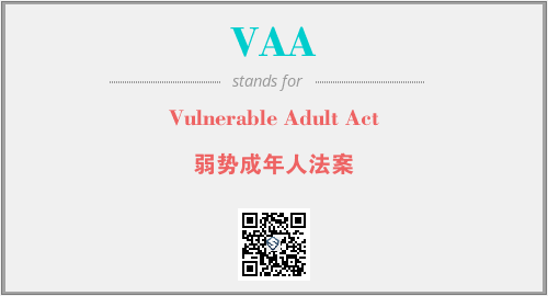 上述内容是“Vulnerable Adult Act”作为“VAA”的缩写,解释为“弱势成年人法案”时的信息,以及英文缩略词VAA所代表的英文单词,其对应的中文拼音、详细解释以及在英文中的流行度和相关分类、应用领域及应用示例等。