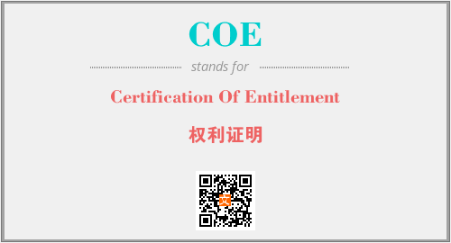 英文缩略词“COE”经常作为“Certification Of Entitlement”的英文缩写来使用,中文表示:“权利证明”。本文将详细介绍英文缩写词COE所代表英文单词,其对应的中文拼音、详细解释以及在英语中的流行度。此外,还有关于缩略词COE的分类、应用领域及相关应用示例等。