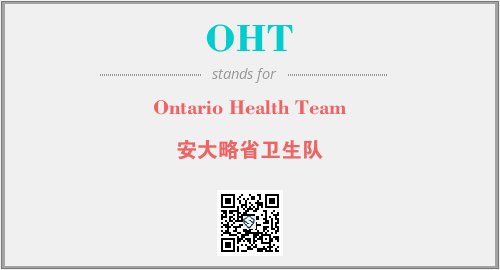 上述内容是“Ontario Health Team”作为“OHT”的缩写,解释为“安大略省卫生队”时的信息,以及英文缩略词OHT所代表的英文单词,其对应的中文拼音、详细解释以及在英文中的流行度和相关分类、应用领域及应用示例等。