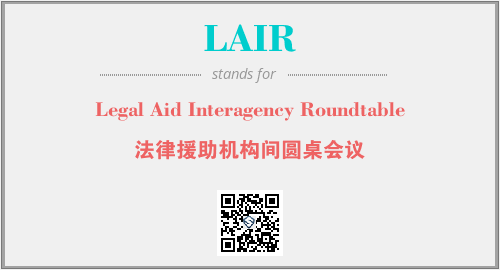 上述内容是“Legal Aid Interagency Roundtable”作为“LAIR”的缩写,解释为“法律援助机构间圆桌会议”时的信息,以及英文缩略词LAIR所代表的英文单词,其对应的中文拼音、详细解释以及在英文中的流行度和相关分类、应用领域及应用示例等。