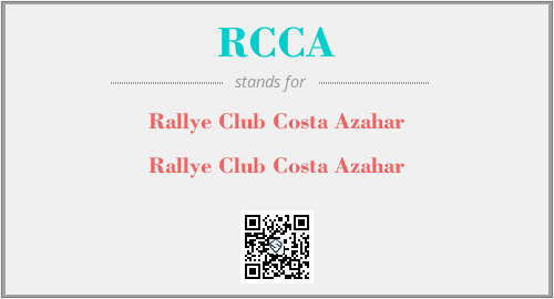 英文缩略词“RCCA”经常作为“Rallye Club Costa Azahar”的英文缩写来使用,中文表示:“Rallye Club Costa Azahar”。本文将详细介绍英文缩写词RCCA所代表英文单词,其对应的中文拼音、详细解释以及在英语中的流行度。此外,还有关于缩略词RCCA的分类、应用领域及相关应用示例等。