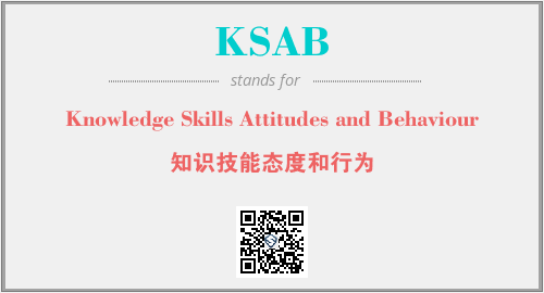 上述内容是“Knowledge Skills Attitudes and Behaviour”作为“KSAB”的缩写,解释为“知识技能态度和行为”时的信息,以及英文缩略词KSAB所代表的英文单词,其对应的中文拼音、详细解释以及在英文中的流行度和相关分类、应用领域及应用示例等。