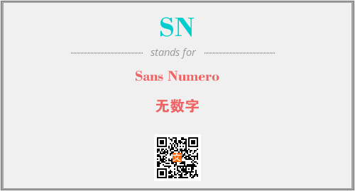 上述内容是“Sans Numero”作为“SN”的缩写,解释为“无数字”时的信息,以及英文缩略词SN所代表的英文单词,其对应的中文拼音、详细解释以及在英文中的流行度和相关分类、应用领域及应用示例等。