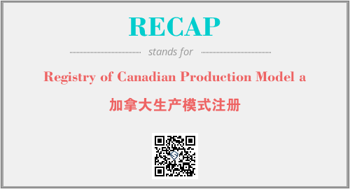 上述内容是“Registry of Canadian Production Model a”作为“RECAP”的缩写,解释为“加拿大生产模式注册”时的信息,以及英文缩略词RECAP所代表的英文单词,其对应的中文拼音、详细解释以及在英文中的流行度和相关分类、应用领域及应用示例等。