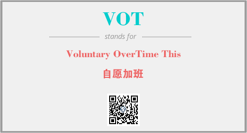 上述内容是“Voluntary OverTime This”作为“VOT”的缩写,解释为“自愿加班”时的信息,以及英文缩略词VOT所代表的英文单词,其对应的中文拼音、详细解释以及在英文中的流行度和相关分类、应用领域及应用示例等。