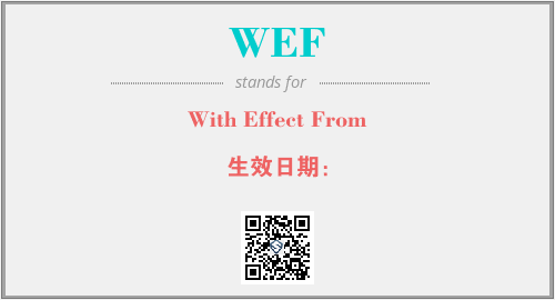 上述内容是“With Effect From”作为“WEF”的缩写,解释为“生效日期:”时的信息,以及英文缩略词WEF所代表的英文单词,其对应的中文拼音、详细解释以及在英文中的流行度和相关分类、应用领域及应用示例等。