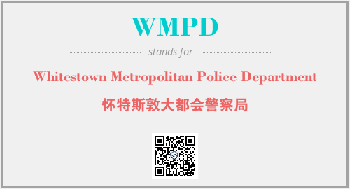 上述内容是“Whitestown Metropolitan Police Department”作为“WMPD”的缩写,解释为“怀特斯敦大都会警察局”时的信息,以及英文缩略词WMPD所代表的英文单词,其对应的中文拼音、详细解释以及在英文中的流行度和相关分类、应用领域及应用示例等。