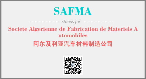 上述内容是“Societe Algerienne de Fabrication de Materiels Automobiles”作为“SAFMA”的缩写,解释为“阿尔及利亚汽车材料制造公司”时的信息,以及英文缩略词SAFMA所代表的英文单词,其对应的中文拼音、详细解释以及在英文中的流行度和相关分类、应用领域及应用示例等。