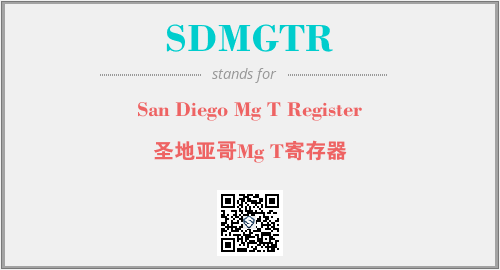 上述内容是“San Diego Mg T Register”作为“SDMGTR”的缩写,解释为“圣地亚哥Mg T寄存器”时的信息,以及英文缩略词SDMGTR所代表的英文单词,其对应的中文拼音、详细解释以及在英文中的流行度和相关分类、应用领域及应用示例等。