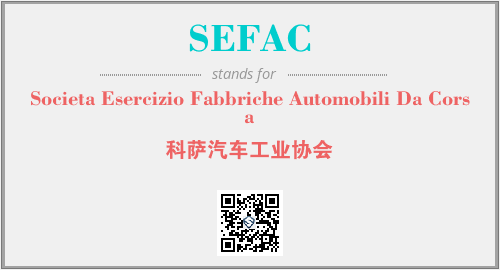 上述内容是“Societa Esercizio Fabbriche Automobili Da Corsa”作为“SEFAC”的缩写,解释为“科萨汽车工业协会”时的信息,以及英文缩略词SEFAC所代表的英文单词,其对应的中文拼音、详细解释以及在英文中的流行度和相关分类、应用领域及应用示例等。