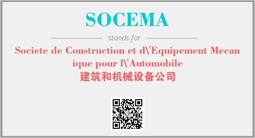 上述内容是“Societe de Construction et d\'Equipement Mecanique pour l\'Automobile”作为“SOCEMA”的缩写,解释为“建筑和机械设备公司”时的信息,以及英文缩略词SOCEMA所代表的英文单词,其对应的中文拼音、详细解释以及在英文中的流行度和相关分类、应用领域及应用示例等。