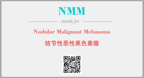 上述内容是“Nodular Malignant Melanoma”作为“NMM”的缩写,解释为“结节性恶性黑色素瘤”时的信息,以及英文缩略词NMM所代表的英文单词,其对应的中文拼音、详细解释以及在英文中的流行度和相关分类、应用领域及应用示例等。