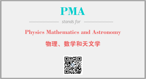 英文缩略词“PMA”经常作为“Physics Mathematics and Astronomy”的英文缩写来使用,中文表示:“物理、数学和天文学”。本文将详细介绍英文缩写词PMA所代表英文单词,其对应的中文拼音、详细解释以及在英语中的流行度。此外,还有关于缩略词PMA的分类、应用领域及相关应用示例等。