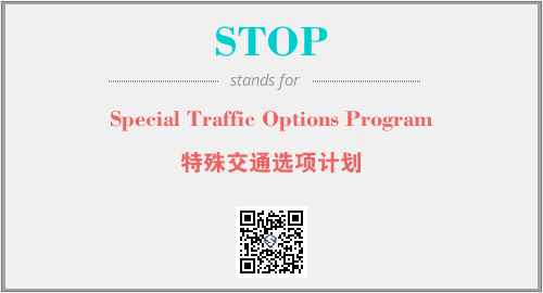 上述内容是“Special Traffic Options Program”作为“STOP”的缩写,解释为“特殊交通选项计划”时的信息,以及英文缩略词STOP所代表的英文单词,其对应的中文拼音、详细解释以及在英文中的流行度和相关分类、应用领域及应用示例等。