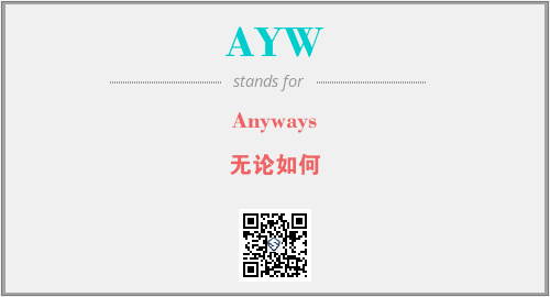 英文缩略词“AYW”经常作为“Anyways”的英文缩写来使用,中文表示:“无论如何”。本文将详细介绍英文缩写词AYW所代表英文单词,其对应的中文拼音、详细解释以及在英语中的流行度。此外,还有关于缩略词AYW的分类、应用领域及相关应用示例等。