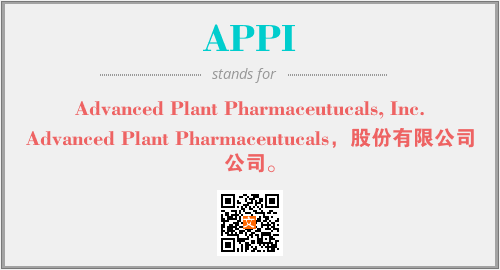 上述内容是“Advanced Plant Pharmaceutucals, Inc.”作为“APPI”的缩写,解释为“Advanced Plant Pharmaceutucals,股份有限公司公司。”时的信息,以及英文缩略词APPI所代表的英文单词,其对应的中文拼音、详细解释以及在英文中的流行度和相关分类、应用领域及应用示例等。