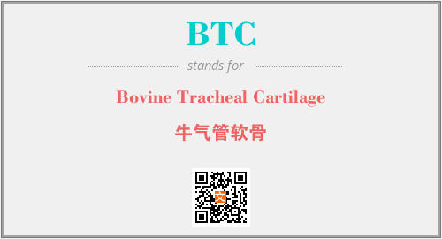 上述内容是“Bovine Tracheal Cartilage”作为“BTC”的缩写,解释为“牛气管软骨”时的信息,以及英文缩略词BTC所代表的英文单词,其对应的中文拼音、详细解释以及在英文中的流行度和相关分类、应用领域及应用示例等。