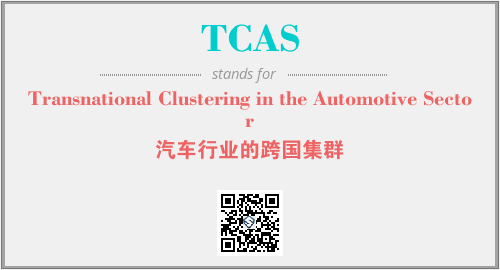 上述内容是“Transnational Clustering in the Automotive Sector”作为“TCAS”的缩写,解释为“汽车行业的跨国集群”时的信息,以及英文缩略词TCAS所代表的英文单词,其对应的中文拼音、详细解释以及在英文中的流行度和相关分类、应用领域及应用示例等。