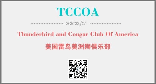 上述内容是“Thunderbird and Cougar Club Of America”作为“TCCOA”的缩写,解释为“美国雷鸟美洲狮俱乐部”时的信息,以及英文缩略词TCCOA所代表的英文单词,其对应的中文拼音、详细解释以及在英文中的流行度和相关分类、应用领域及应用示例等。