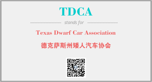 上述内容是“Texas Dwarf Car Association”作为“TDCA”的缩写,解释为“德克萨斯州矮人汽车协会”时的信息,以及英文缩略词TDCA所代表的英文单词,其对应的中文拼音、详细解释以及在英文中的流行度和相关分类、应用领域及应用示例等。