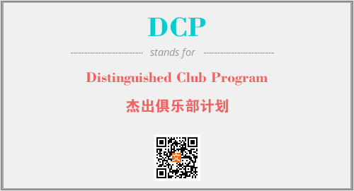 英文缩略词“DCP”经常作为“Distinguished Club Program”的英文缩写来使用,中文表示:“杰出俱乐部计划”。本文将详细介绍英文缩写词DCP所代表英文单词,其对应的中文拼音、详细解释以及在英语中的流行度。此外,还有关于缩略词DCP的分类、应用领域及相关应用示例等。