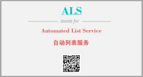 英文缩略词“ALS”经常作为“Automated List Service”的英文缩写来使用,中文表示:“自动列表服务”。本文将详细介绍英文缩写词ALS所代表英文单词,其对应的中文拼音、详细解释以及在英语中的流行度。此外,还有关于缩略词ALS的分类、应用领域及相关应用示例等。