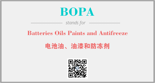 上述内容是“Batteries Oils Paints and Antifreeze”作为“BOPA”的缩写,解释为“电池油、油漆和防冻剂”时的信息,以及英文缩略词BOPA所代表的英文单词,其对应的中文拼音、详细解释以及在英文中的流行度和相关分类、应用领域及应用示例等。