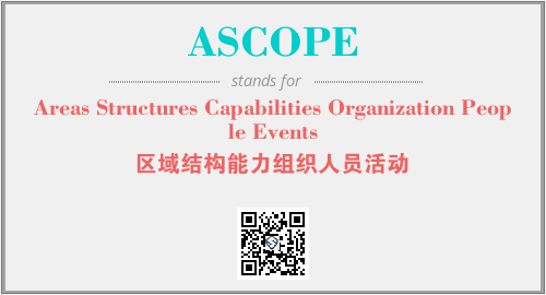 上述内容是“Areas Structures Capabilities Organization People Events”作为“ASCOPE”的缩写,解释为“区域结构能力组织人员活动”时的信息,以及英文缩略词ASCOPE所代表的英文单词,其对应的中文拼音、详细解释以及在英文中的流行度和相关分类、应用领域及应用示例等。