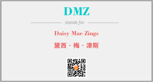 上述内容是“Daisy Mae Zings”作为“DMZ”的缩写,解释为“黛西·梅·津斯”时的信息,以及英文缩略词DMZ所代表的英文单词,其对应的中文拼音、详细解释以及在英文中的流行度和相关分类、应用领域及应用示例等。
