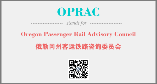 上述内容是“Oregon Passenger Rail Advisory Council”作为“OPRAC”的缩写,解释为“俄勒冈州客运铁路咨询委员会”时的信息,以及英文缩略词OPRAC所代表的英文单词,其对应的中文拼音、详细解释以及在英文中的流行度和相关分类、应用领域及应用示例等。