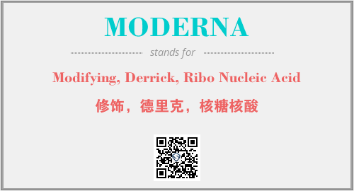 上述内容是“Modifying, Derrick, Ribo Nucleic Acid”作为“MODERNA”的缩写,解释为“修饰,德里克,核糖核酸”时的信息,以及英文缩略词MODERNA所代表的英文单词,其对应的中文拼音、详细解释以及在英文中的流行度和相关分类、应用领域及应用示例等。