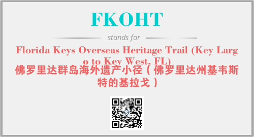 上述内容是“Florida Keys Overseas Heritage Trail (Key Largo to Key West, FL)”作为“FKOHT”的缩写,解释为“佛罗里达群岛海外遗产小径(佛罗里达州基韦斯特的基拉戈)”时的信息,以及英文缩略词FKOHT所代表的英文单词,其对应的中文拼音、详细解释以及在英文中的流行度和相关分类、应用领域及应用示例等。